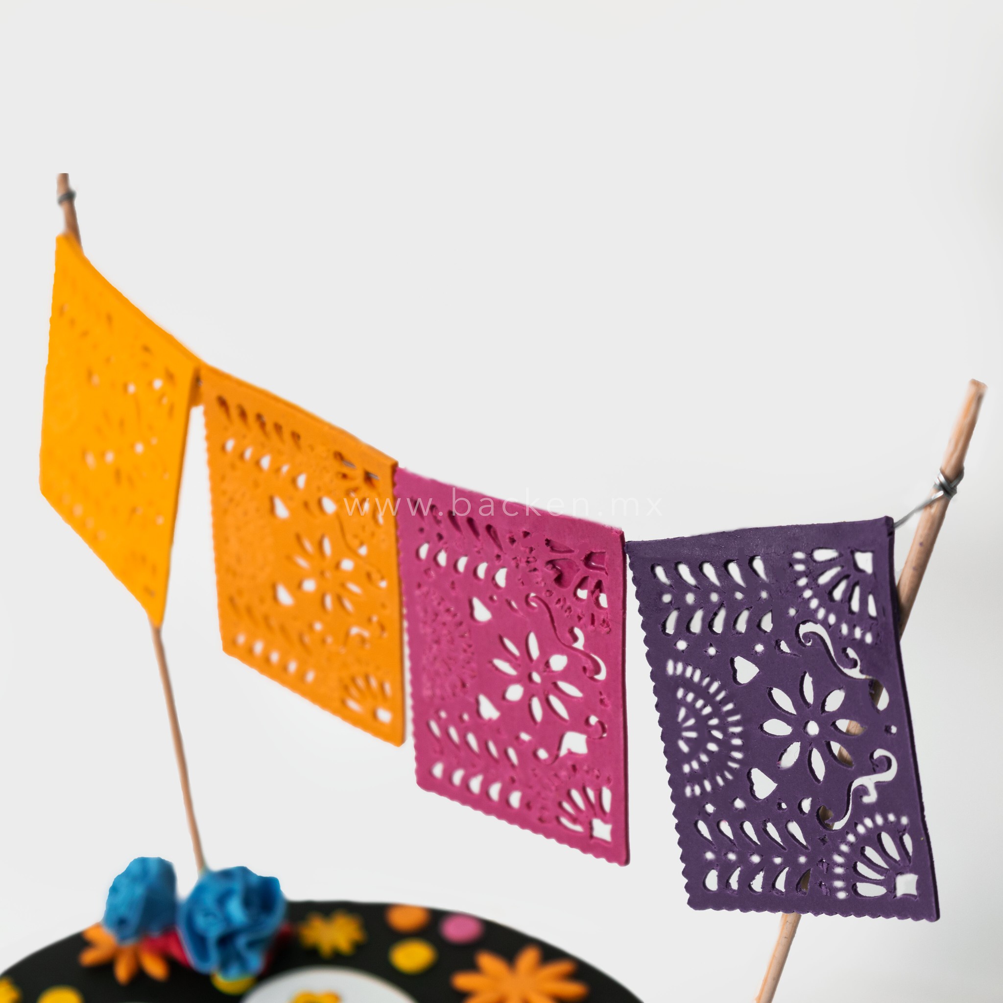 Sobre el pastel se aprecian calaveritas, un corazón y detalles de papel picado elaborados en fondant, cuidadosamente diseñados.
