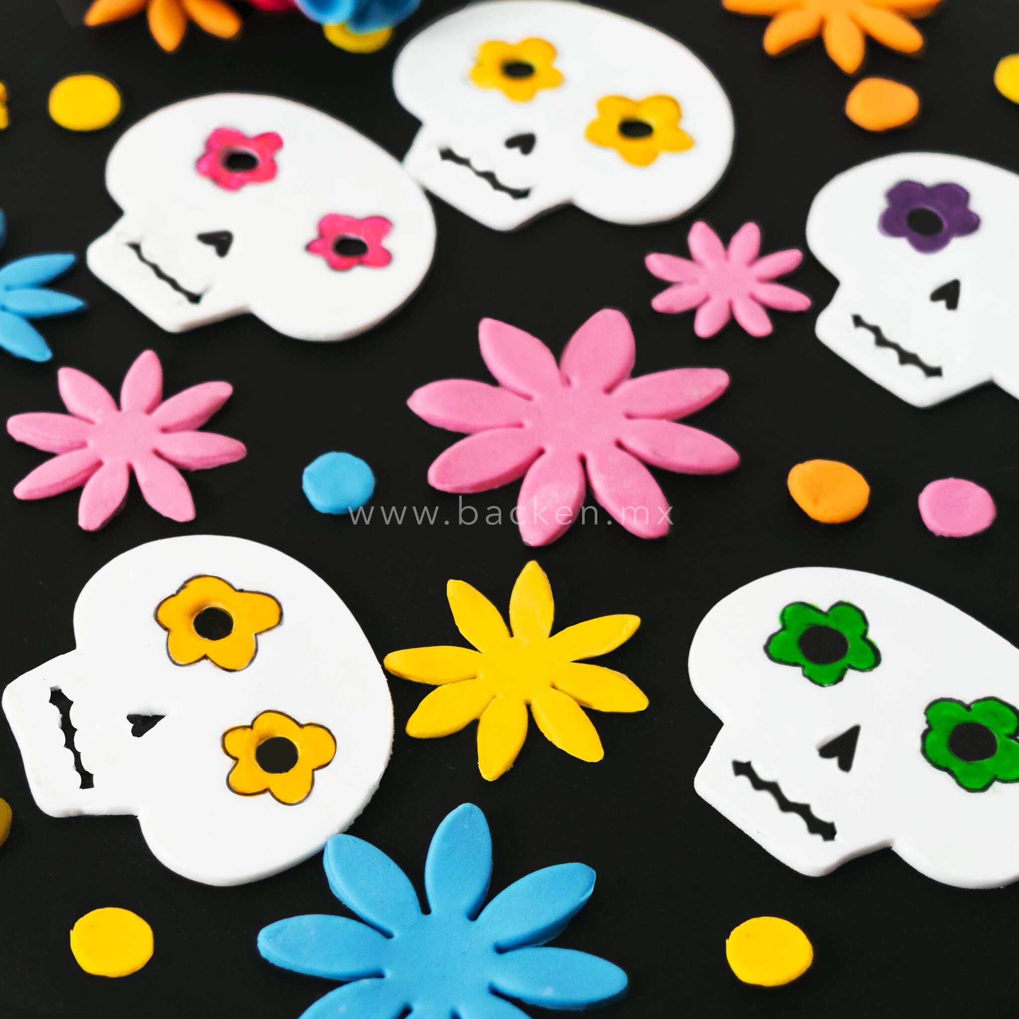 Este pastel personalizado con temática de Día de Muertos está inspirado en la belleza simbólica de un altar tradicional mexicano. Su diseño de un solo piso con acabado negro mate en fondant crea una base sobria y elegante que permite resaltar las decoraciones multicolor.