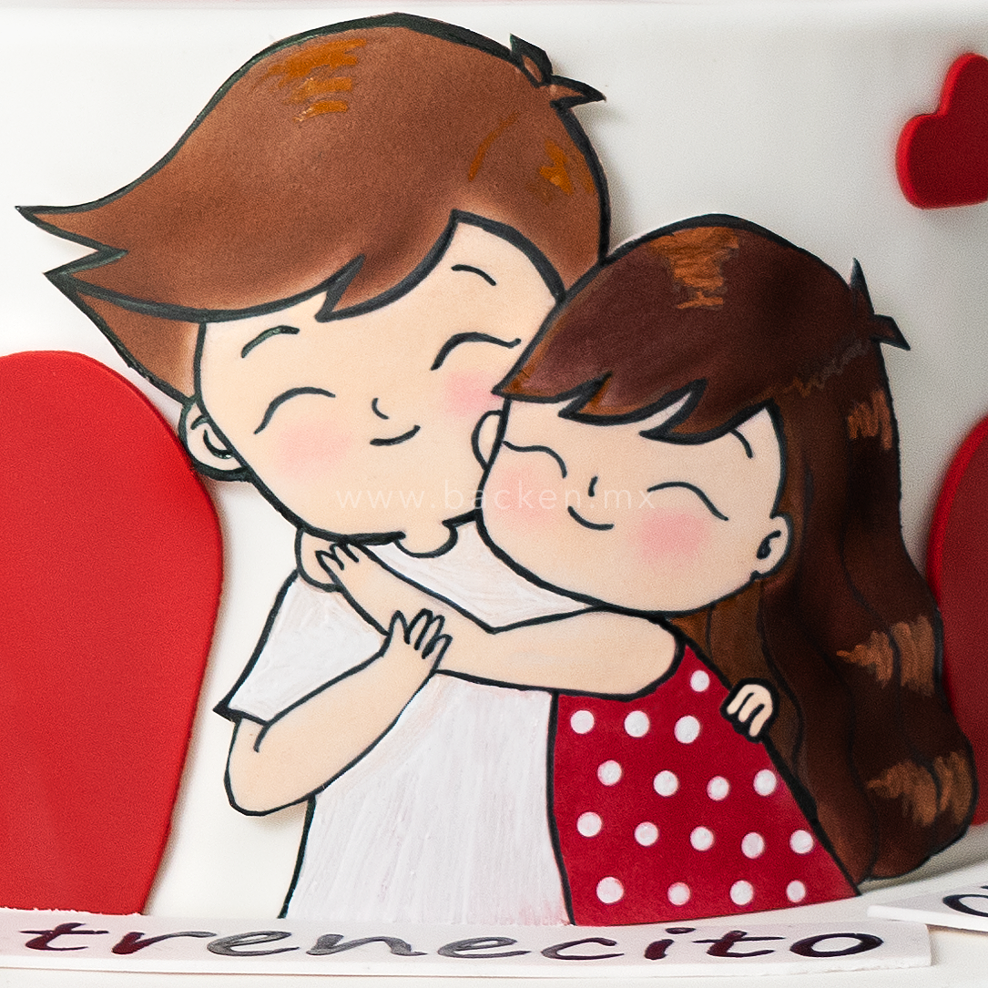 Celebra el amor más tierno con nuestro pastel personalizado de San Valentín. Decorado con ilustraciones adorables de una pareja abrazándose, corazones rojos en fondant y un hermoso detalle de corazones apilados en la parte superior, este pastel es pura ternura.