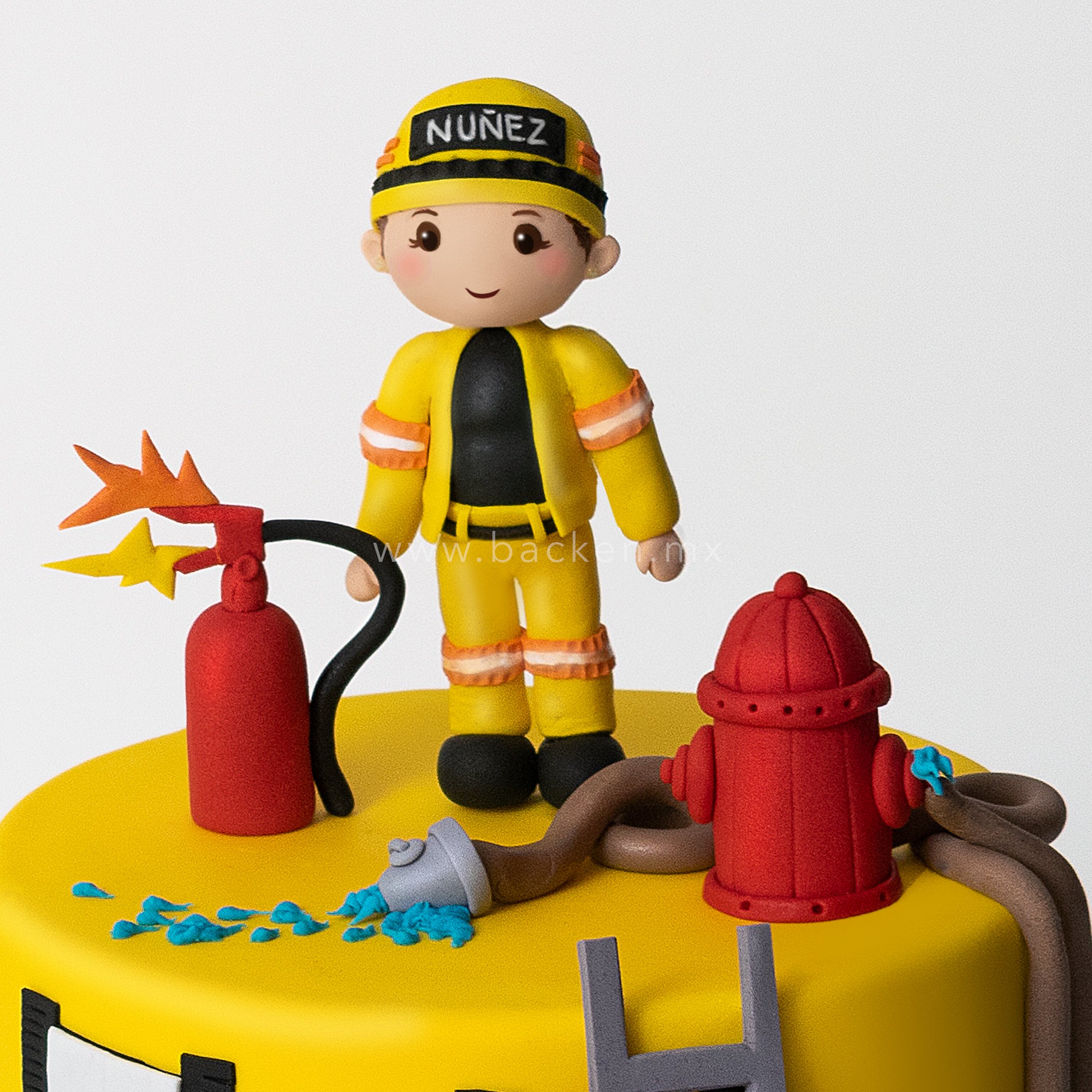 Celebra el valor y la vocación de servicio con nuestro pastel personalizado para bombero, una creación diseñada para rendir homenaje a quienes arriesgan todo por los demás. Sobre el pastel destaca una figura de fondant perfectamente elaborada, que representa al bombero con gran realismo y atención al detalle.