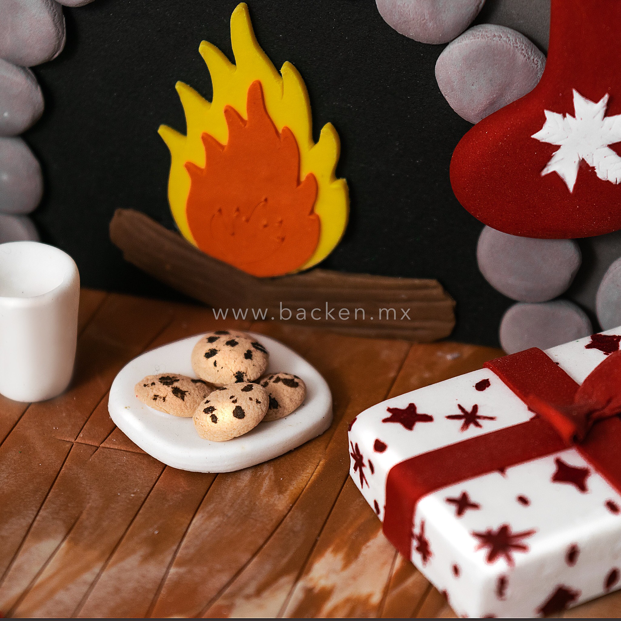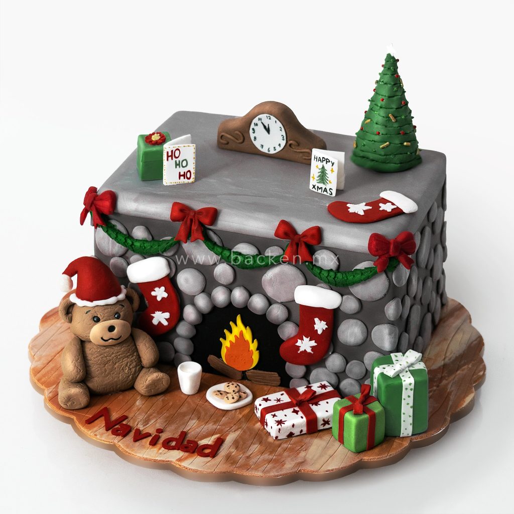 La calidez de la Navidad llega directo a tu mesa con nuestro pastel navideño personalizado en forma de chimenea. Decorado con detalles festivos en fondant, como botas colgantes, guirnaldas, velas y pequeños regalos, este pastel recrea la escena perfecta donde Santa Claus dejaría sus obsequios.