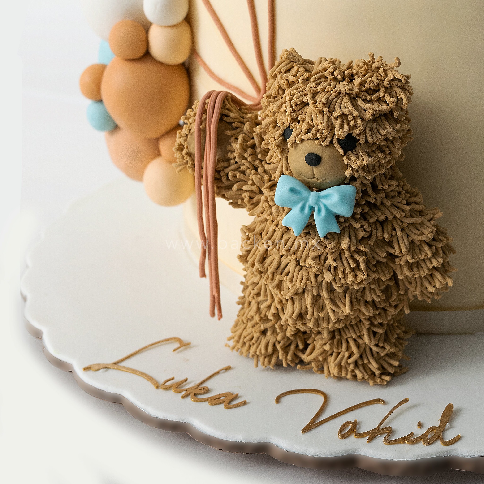 Este pastel personalizado para niño combina tonos pastel y cafés para lograr una estética elegante y armoniosa. A un costado del pastel destaca un tierno osito perfectamente esculpido en fondant, que sostiene una cascada de globos los cuales se extienden y descansan sobre la parte superior, cubriendo un costado y gran parte de la superficie del pastel. El diseño transmite ternura, estilo y sofisticación, convirtiéndolo en una opción ideal para celebrar un momento especial con un pastel artístico y memorable para tu pequeño.