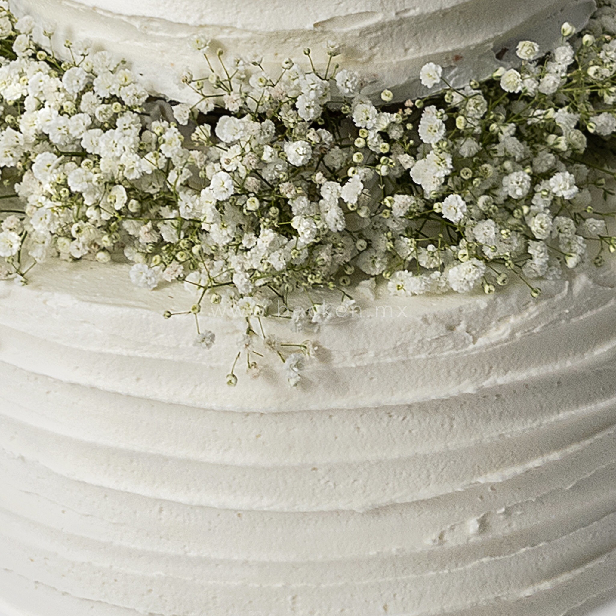 Este pastel personalizado para boda de tres pisos está cubierto de betún cremoso color beige, creando una apariencia suave y refinada. Cada nivel se eleva con bases especiales que permiten lucir pequeñas flores en tonos beige con follaje verde, logrando un diseño equilibrado, natural y lleno de elegancia para una boda fresca y sofisticada.