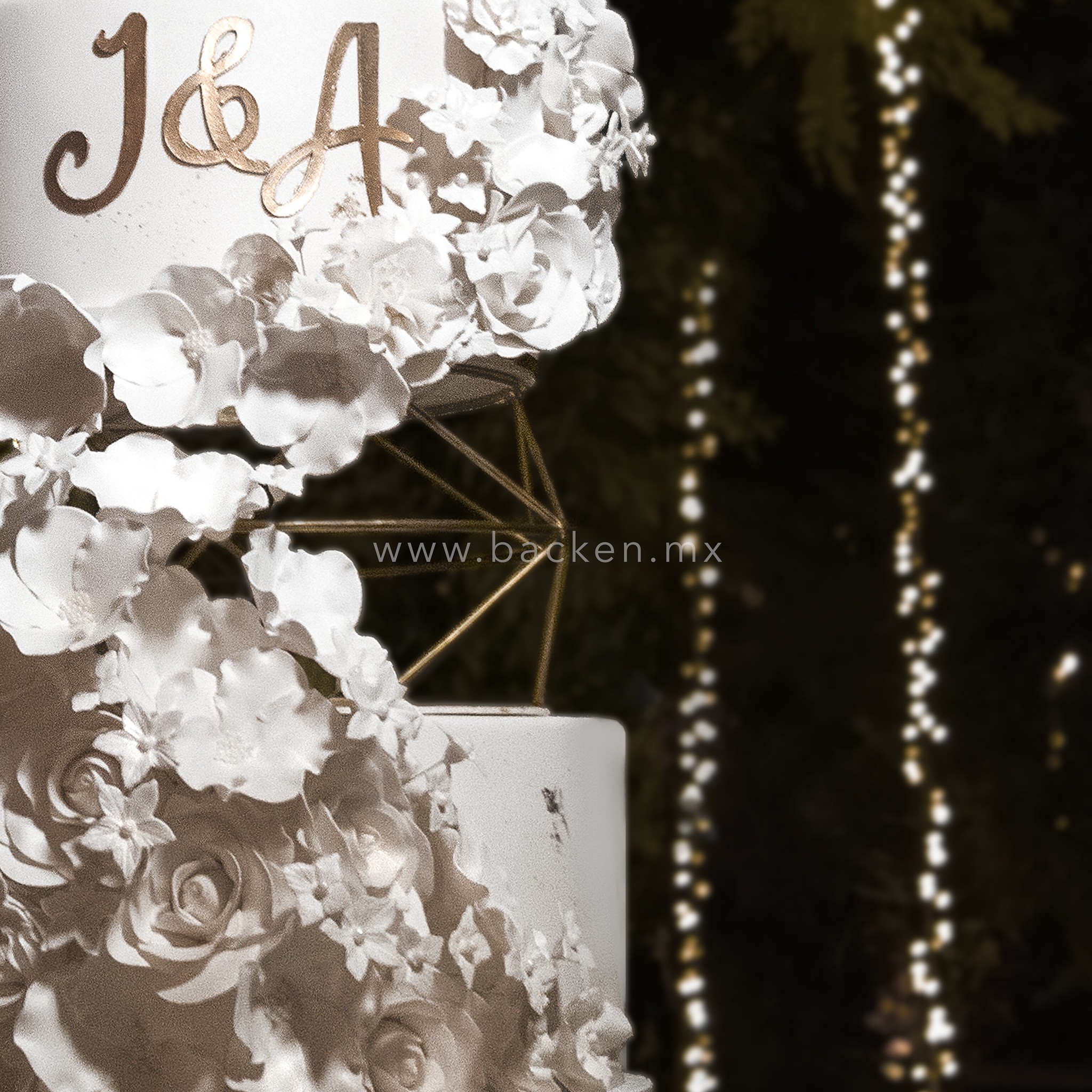 Pastel de bodas elegante de cuatro pisos decorado con una fina cascada de flores hechas con fondant de la más alta calidad, entre cada piso lleva una estructura de metal que agrega sofisticación y elegancia al diseño.
