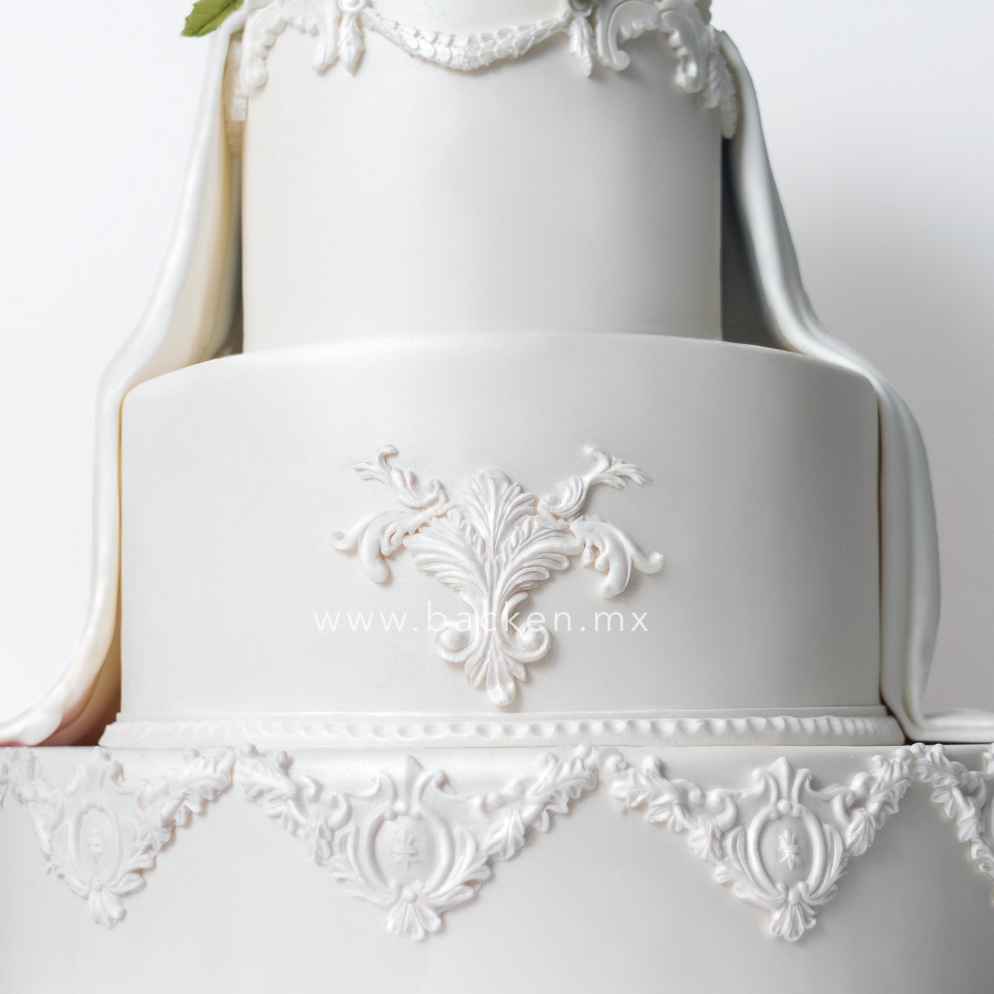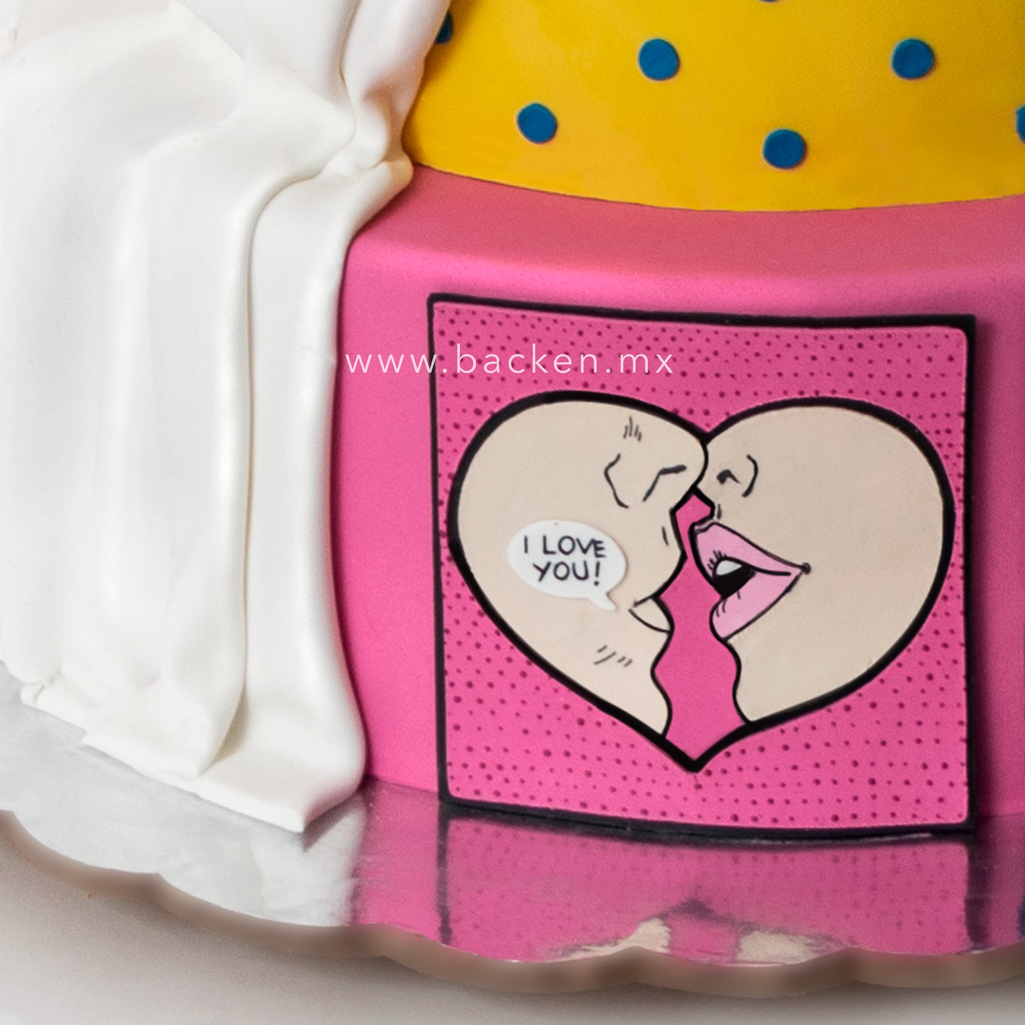 Este pastel personalizado para boda de tres pisos destaca por su diseño único y creativo, una mitad decorada en estilo cómic en fondant lleno de carácter y la otra mitad decorada en fondant blanco con acabados clásicos y elegantes. En la parte superior, un ramo de flores perfectamente esculpidas en fondant une ambos estilos, creando una pieza sorprendente y memorable para una boda fuera de lo tradicional.