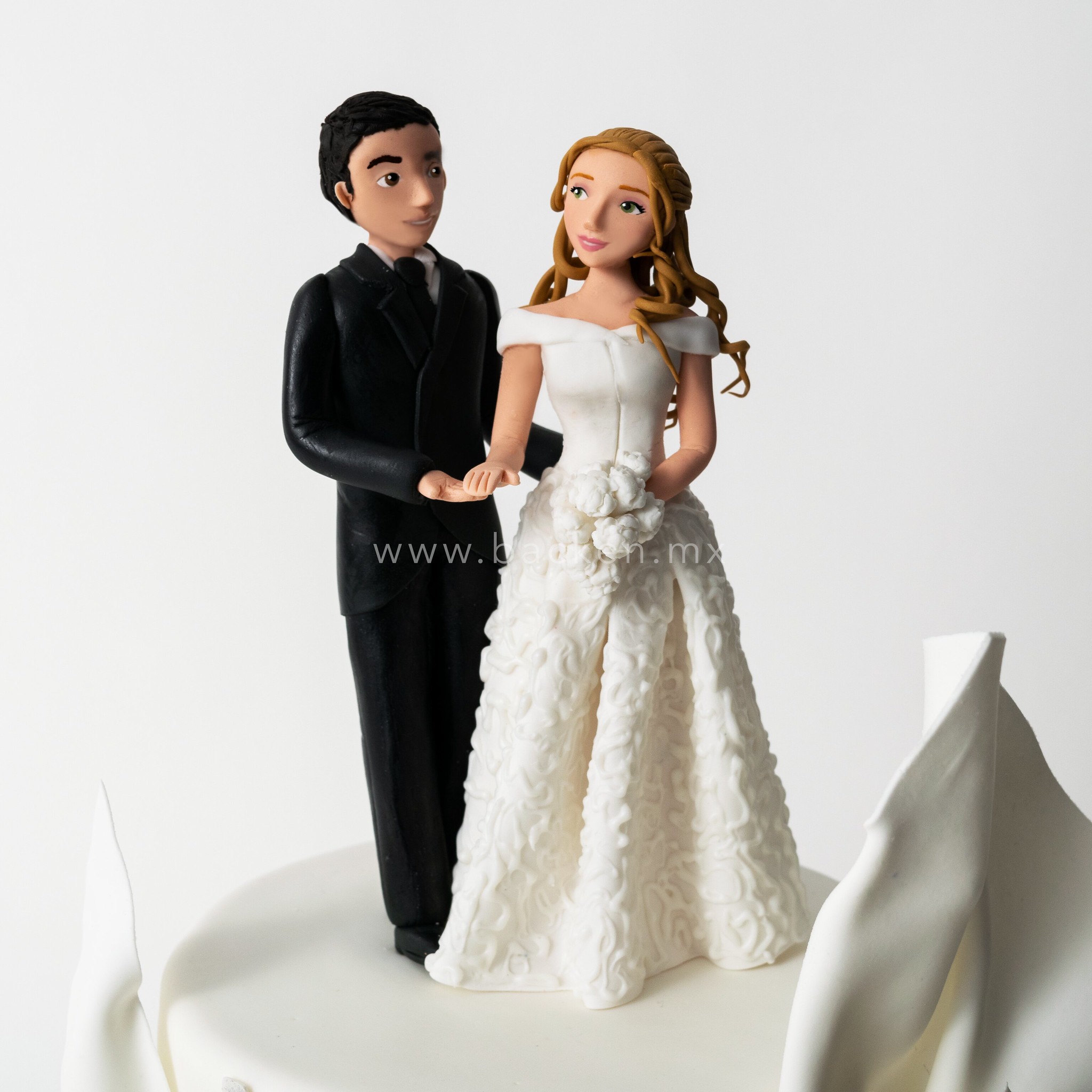 Este pastel personalizado para boda de dos pisos destaca por su elegancia y diseño artístico, los novios están perfectamente esculpidos en fondant y al frente del pastel se aprecian finas capas de fondant que se despliegan con sutileza, creando un efecto visual único, sofisticado y contemporáneo, ideal para parejas que buscan un pastel exclusivo y lleno de estilo para su gran día.