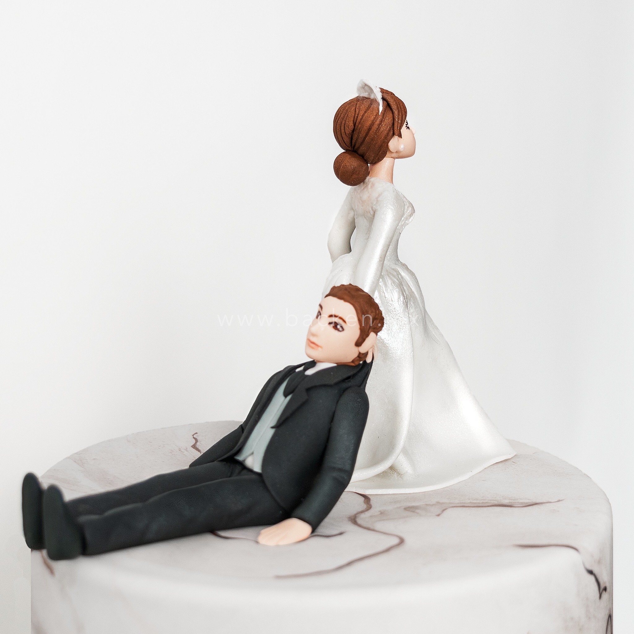 Este pastel personalizado para boda de tres pisos está forrado en fino fondant con un elegante acabado marmoleado en tonos gris y blanco, logrando un estilo moderno y sofisticado. En la parte superior destacan los novios perfectamente esculpidos en fondant, mientras que un bello tocado de rosas blancas naturales recorre el frente del pastel, aportando un toque de belleza, armonía y romanticismo ideal para una boda inolvidable.