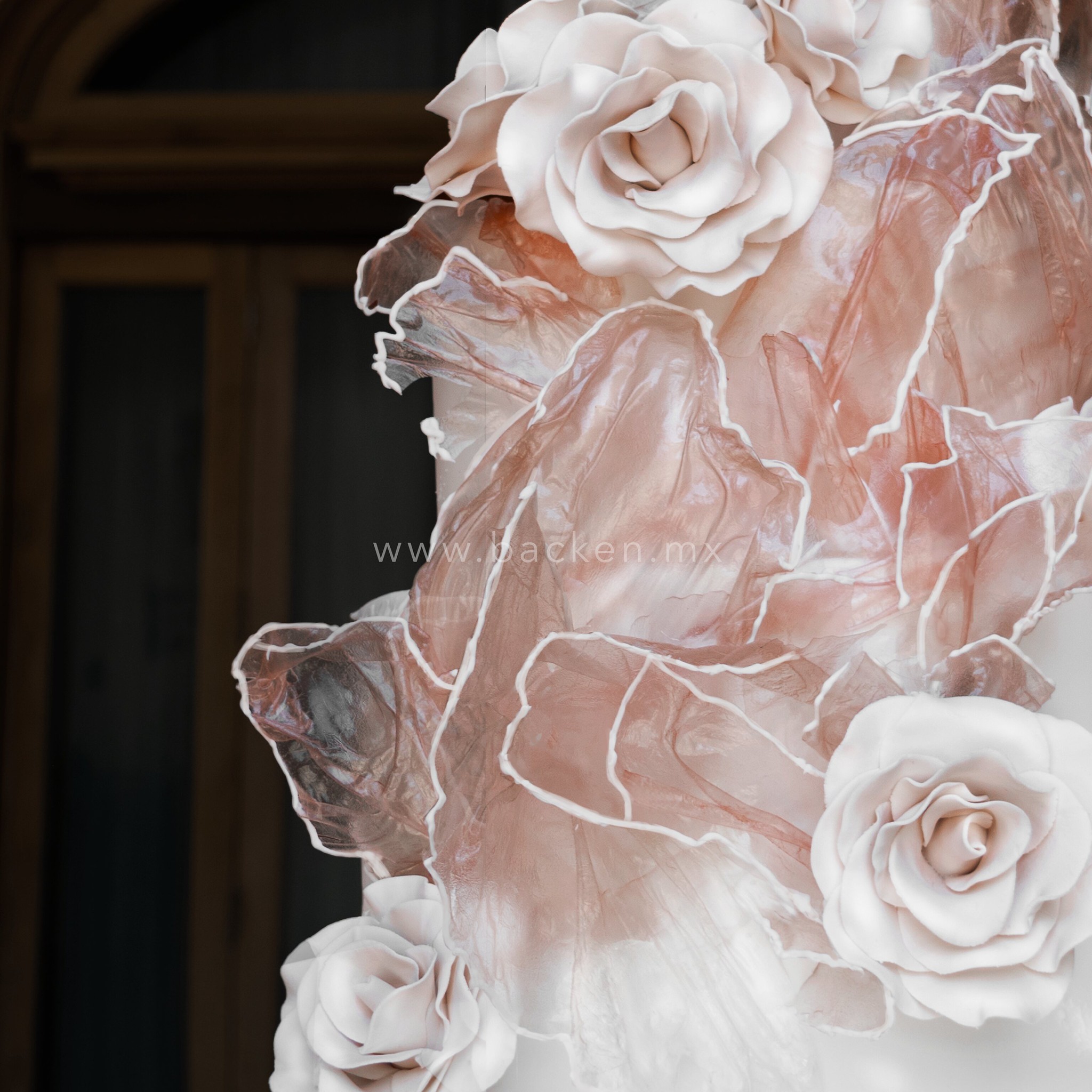 Este pastel personalizado para boda de tres pisos combina caramelo rosa asimétrico con efecto pétalos y flores blancas esculpidas en fondant, logrando una composición artística y sofisticada. Su diseño exclusivo y hecho a medida lo convierte en una pieza central perfecta para bodas que buscan originalidad, elegancia y un estilo verdaderamente único.