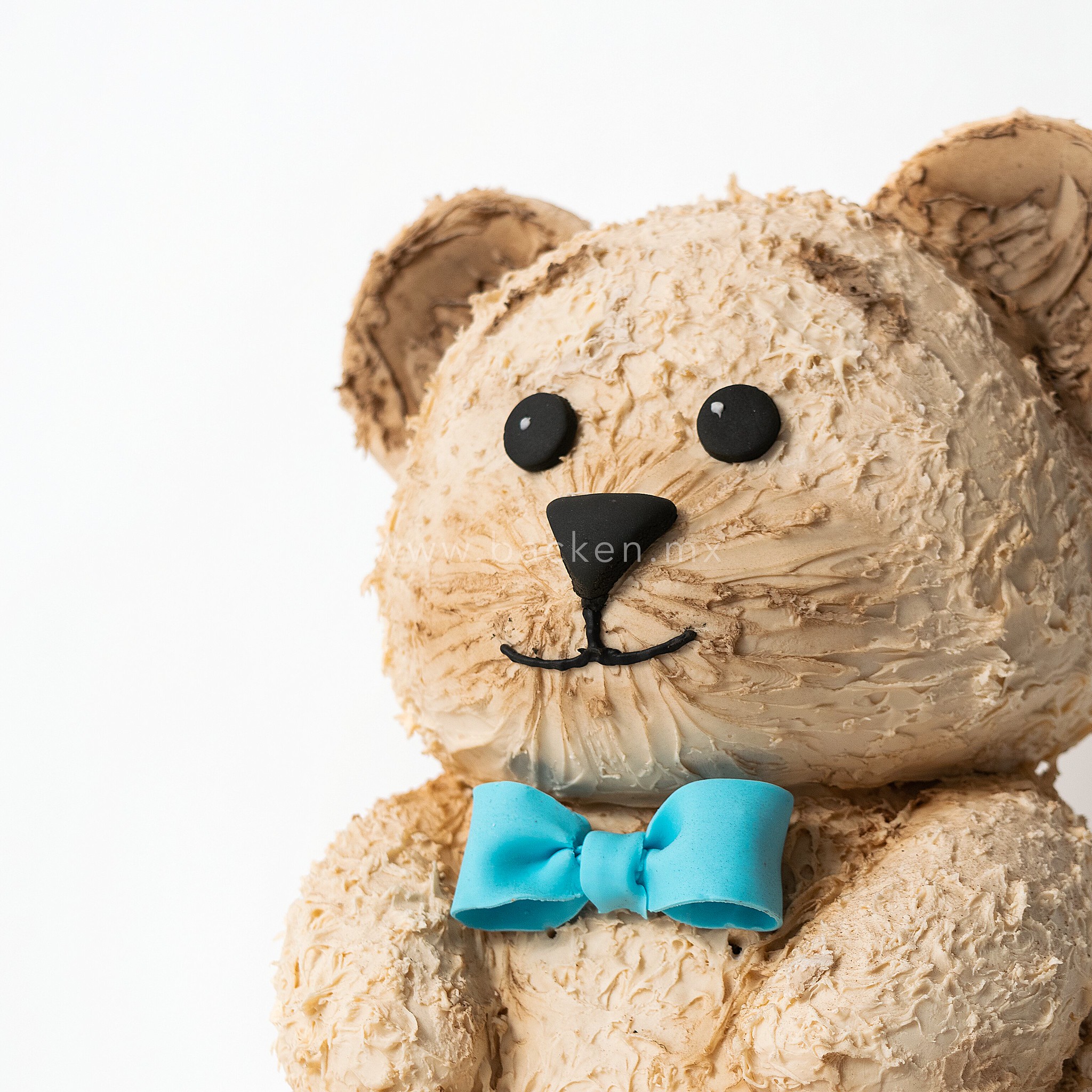 Este pastel personalizado para niño en forma de osito teddy está completamente esculpido para lograr una figura tierna y encantadora, con una carita adorable que transmite dulzura y calidez. El diseño se complementa con un pequeño moño azul en el cuello, aportando un detalle elegante y delicado que realza su estética. Es la opción perfecta para celebrar el cumpleaños de tu peque con un pastel, tierno y memorable.