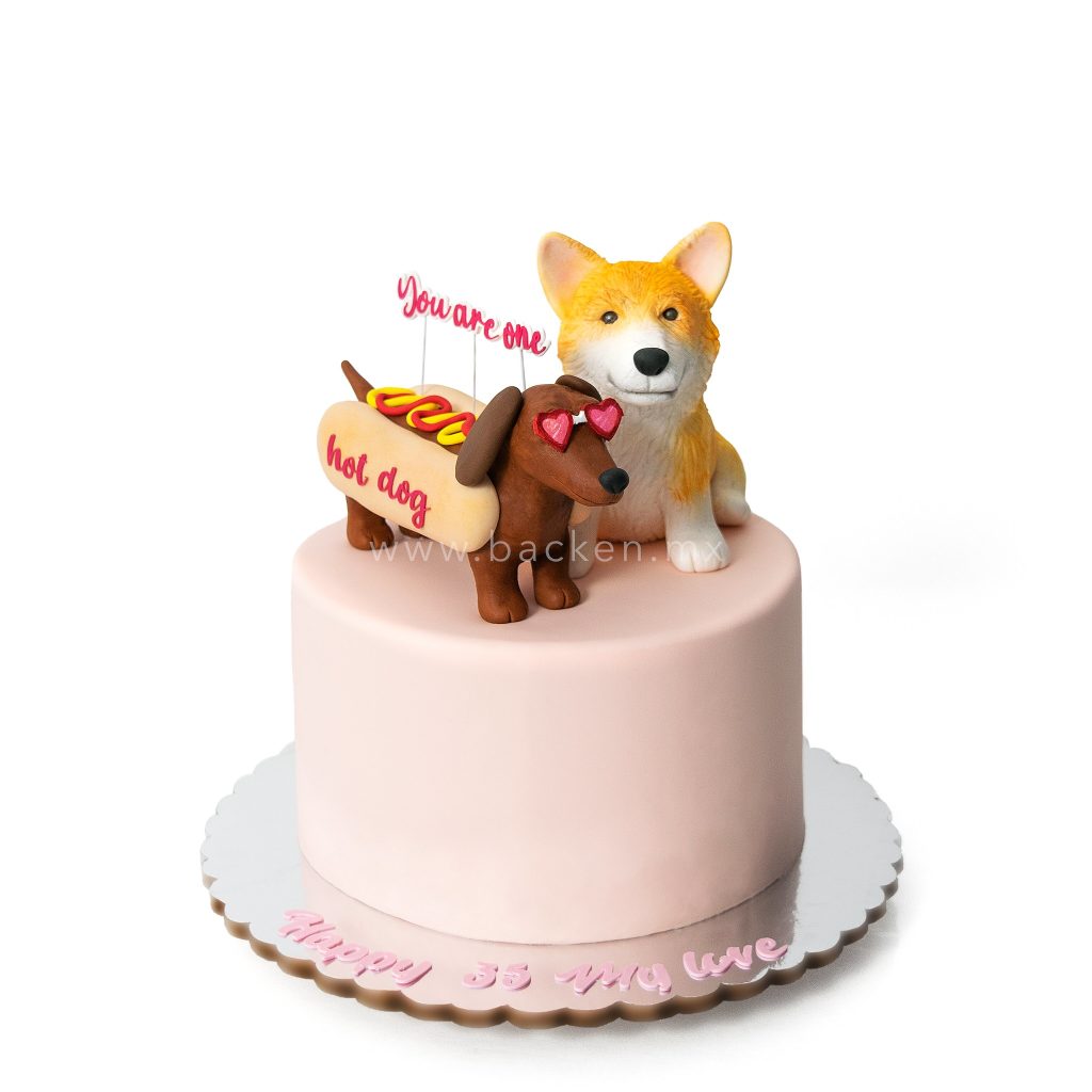 Celebra el amor más puro con nuestro pastel personalizado de San Valentín, decorado con dos adorables perritos enamorados en fondant sobre la parte superior. Un diseño tierno y romántico que transmite cariño en cada detalle, perfecto para sorprender a esa persona especial.