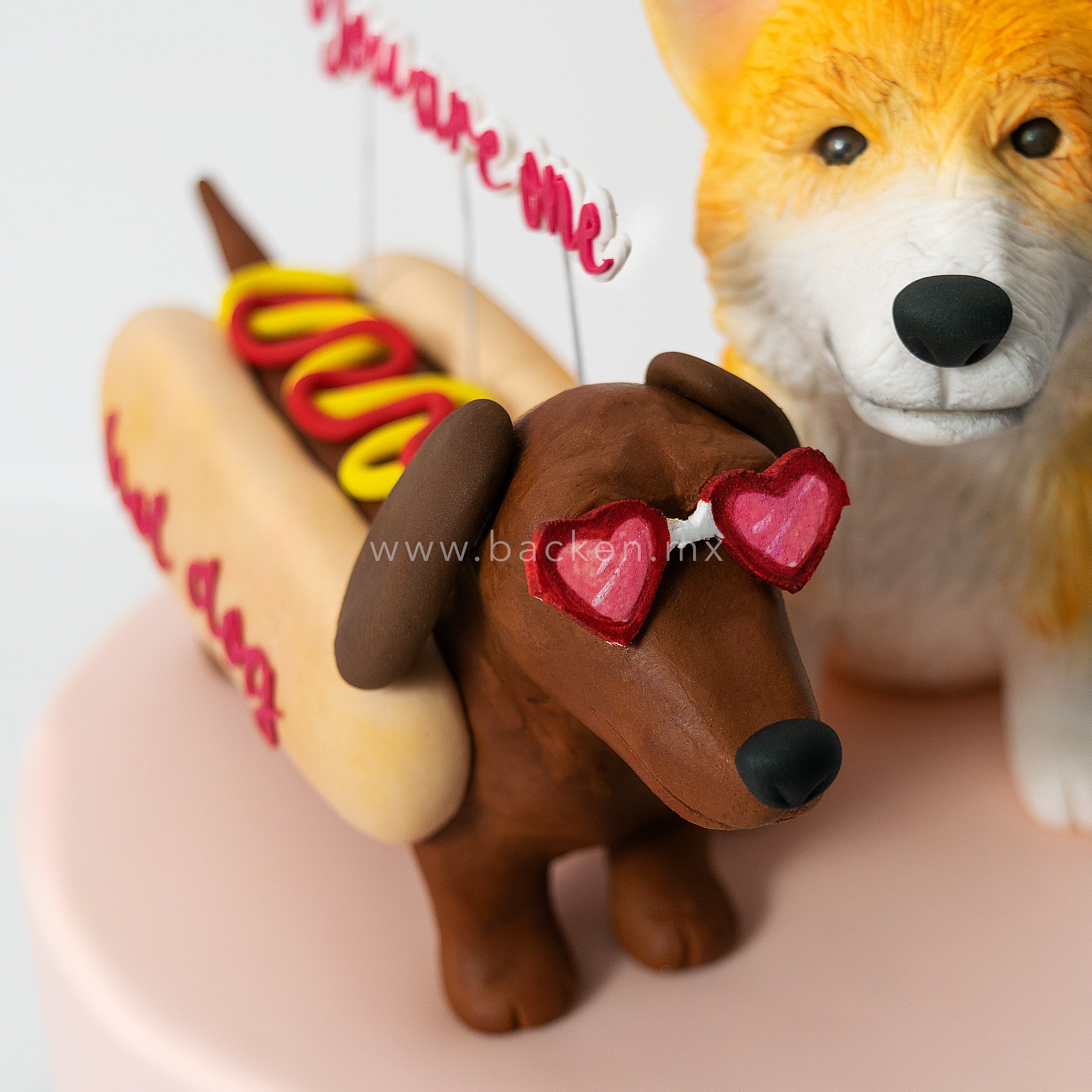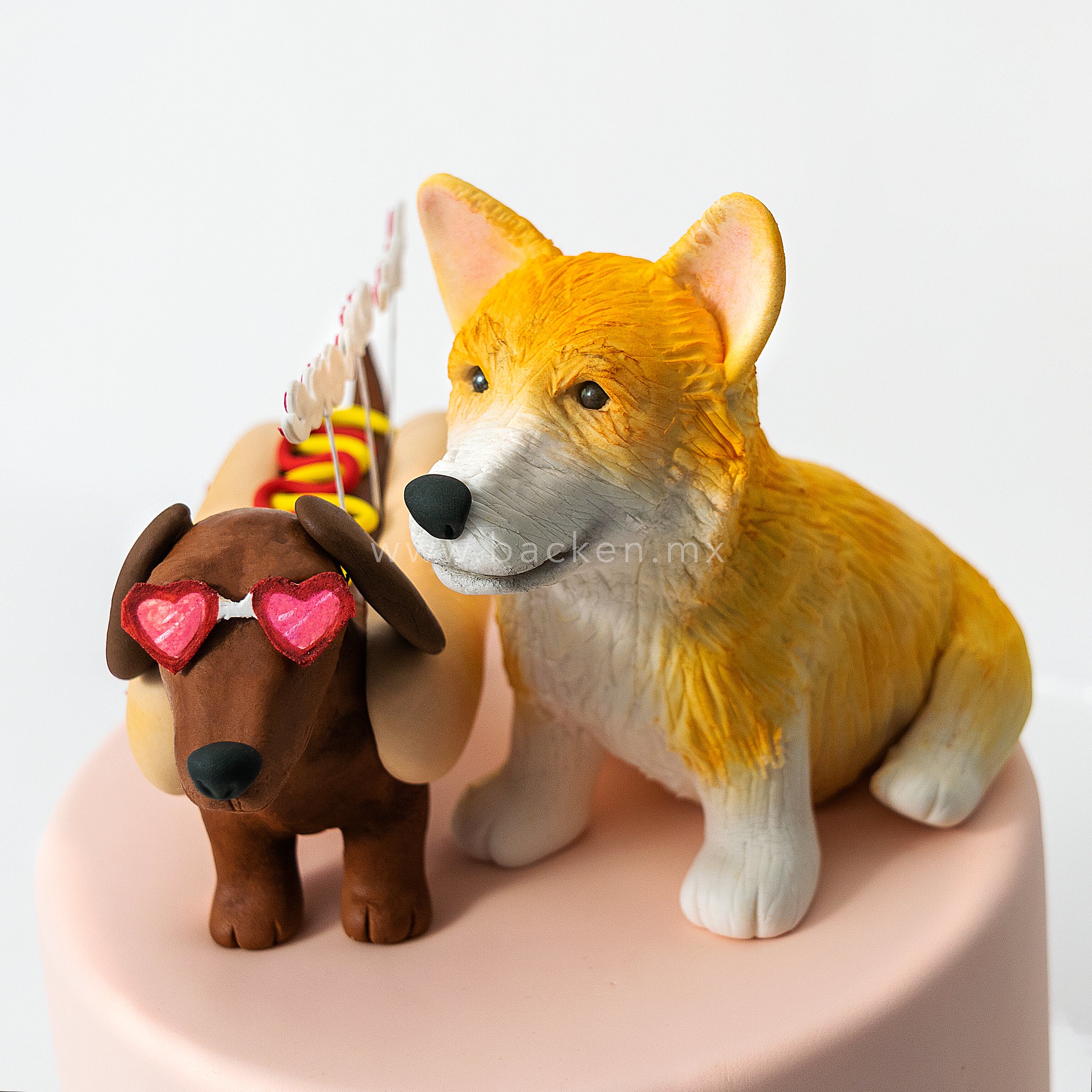 Celebra el amor más puro con nuestro pastel personalizado de San Valentín, decorado con dos adorables perritos enamorados en fondant sobre la parte superior. Un diseño tierno y romántico que transmite cariño en cada detalle, perfecto para sorprender a esa persona especial.
