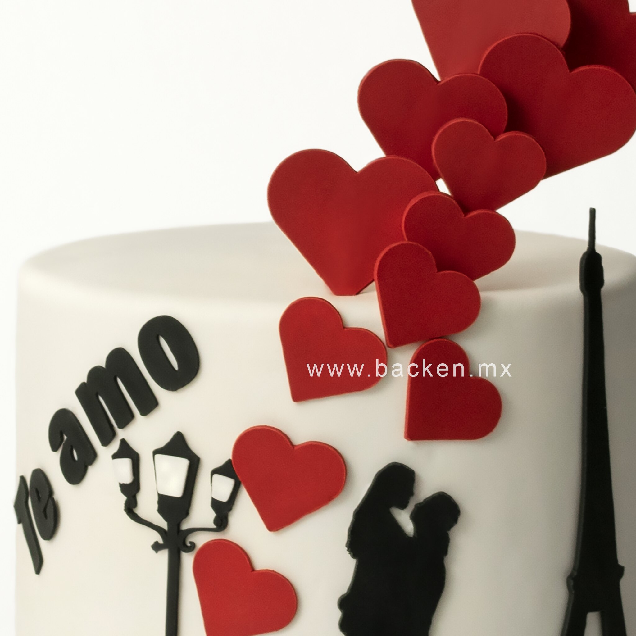 Celebra el amor con un pastel personalizado de San Valentín que convierte cualquier momento en algo inolvidable. Su diseño está decorado con corazones en fondant, una pareja dándose un tierno beso y la icónica Torre Eiffel, símbolo universal del romance y los grandes amores.