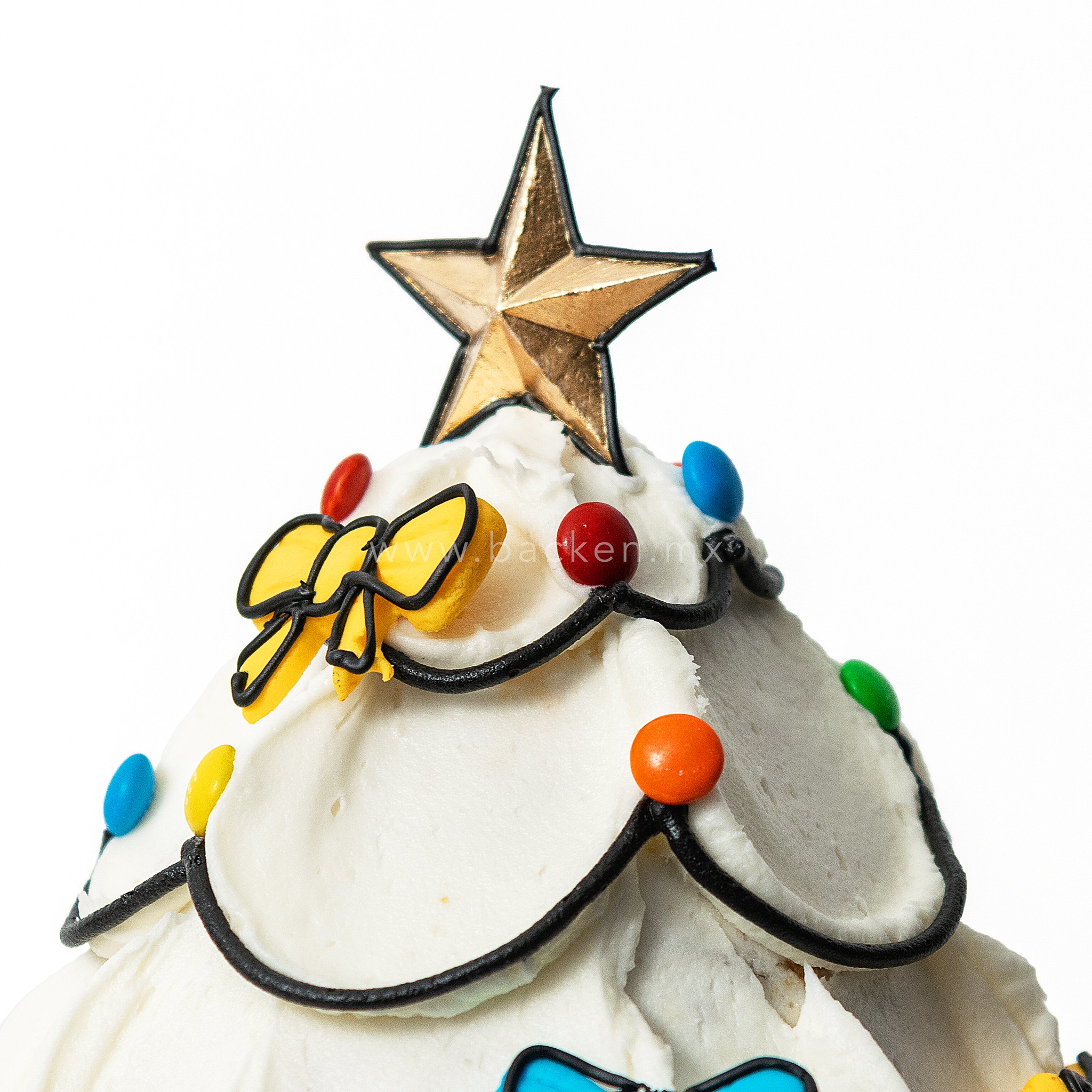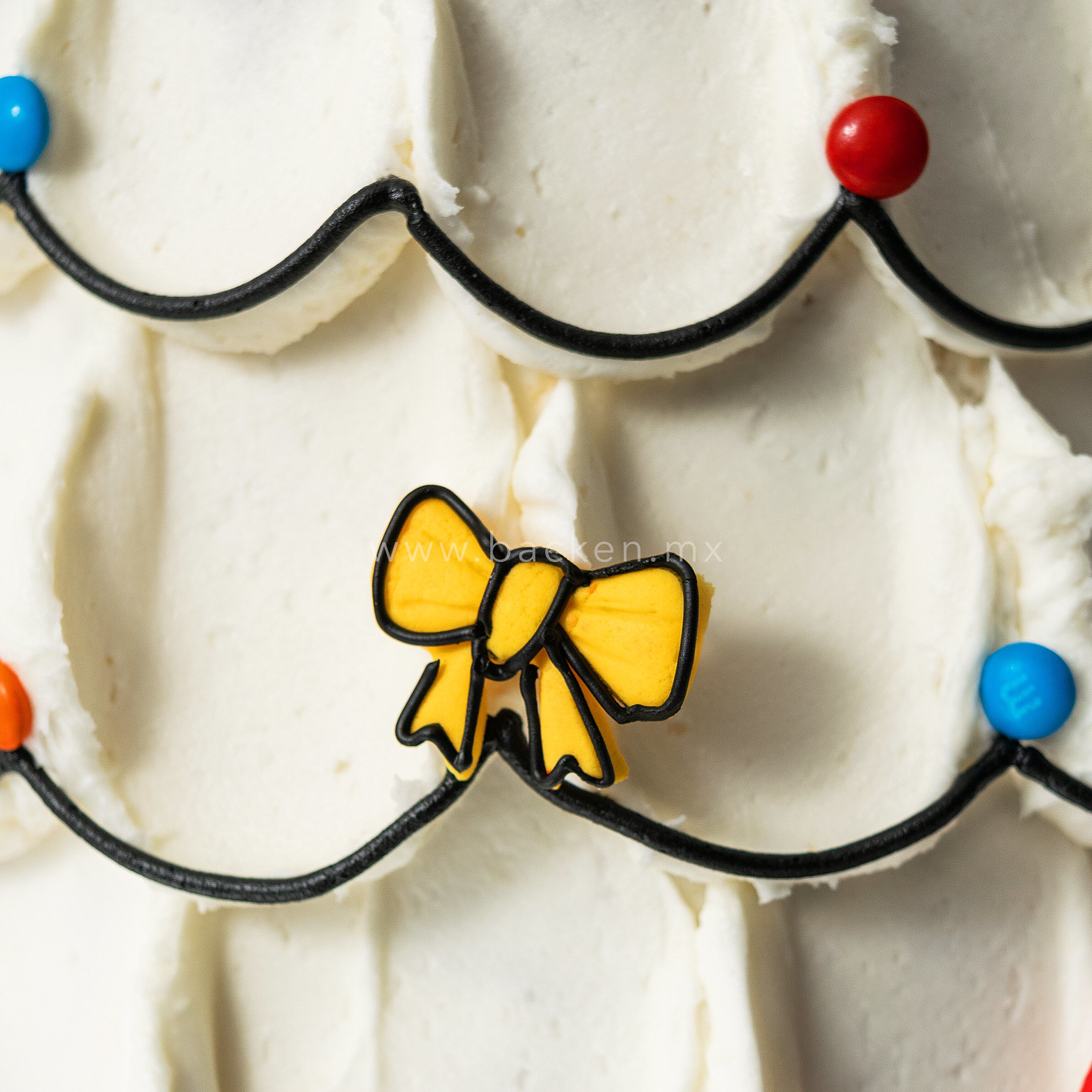 Haz brillar tu mesa esta Navidad con un pastel navideño personalizado en forma de pino, cuidadosamente esculpido en delicioso bizcocho y decorado con un cremoso betún color beige que le da un toque elegante y cálido. Cada ramita está adornada con chocolates de colores que simulan luces navideñas, creando un efecto encantador que hace que este pastel parezca salido de un cuento invernal.