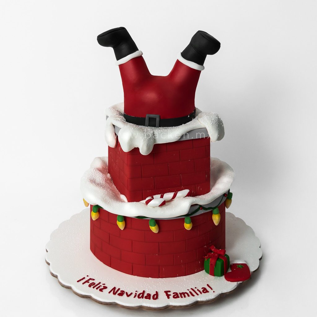 ¡La Navidad nunca fue tan divertida! Nuestro pastel navideño de dos pisos recrea una encantadora chimenea decorada en tonos festivos, donde se pueden ver las piernas y la pancita de Santa Claus atoradas entre el betún y el fondant.