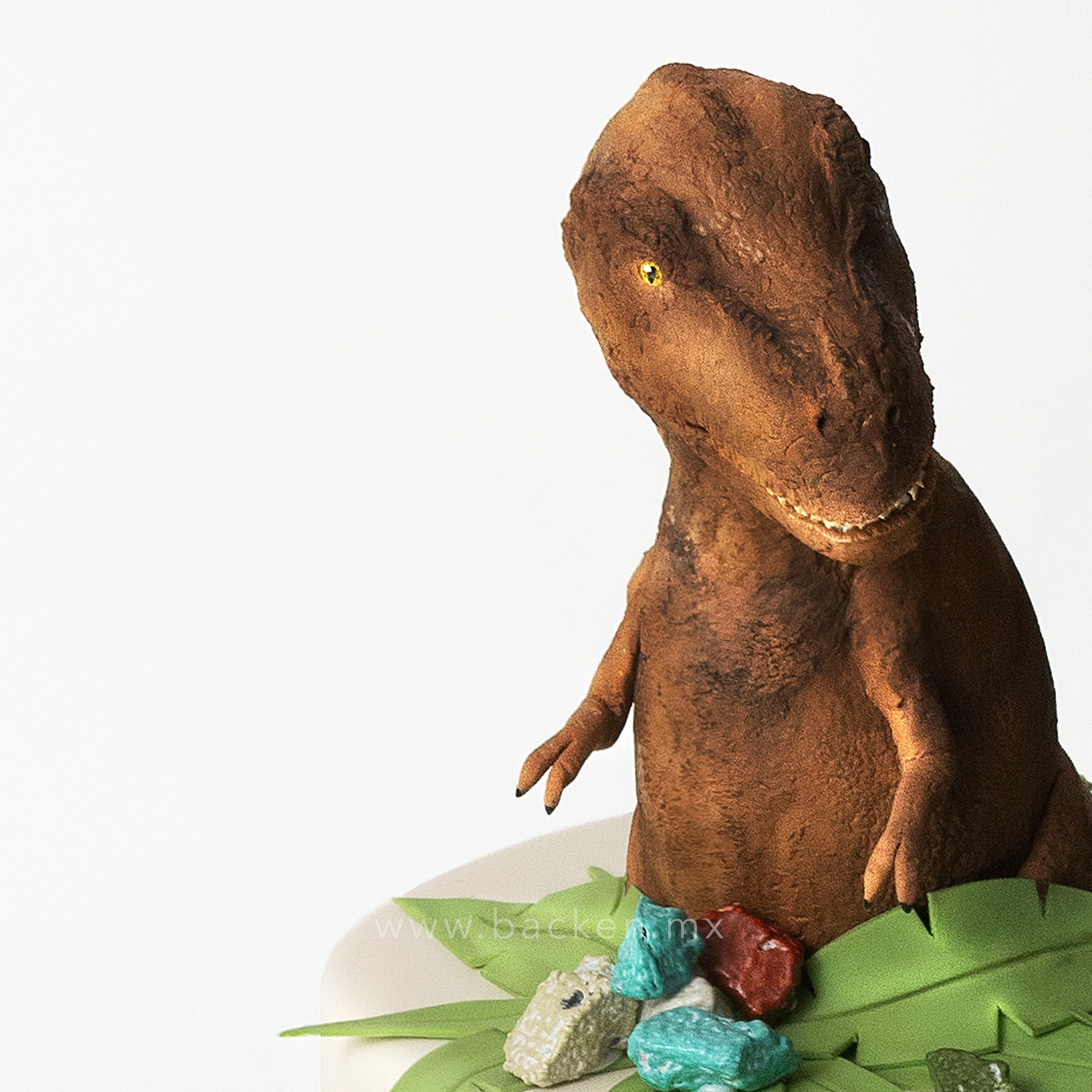 Este pastel personalizado de dinosaurio destaca por una figura imponente en fondant, cuidadosamente esculpida para convertirse en el centro absoluto del diseño. Cada detalle está pensado para sorprender y crear un pastel espectacular que roba miradas desde cualquier ángulo.