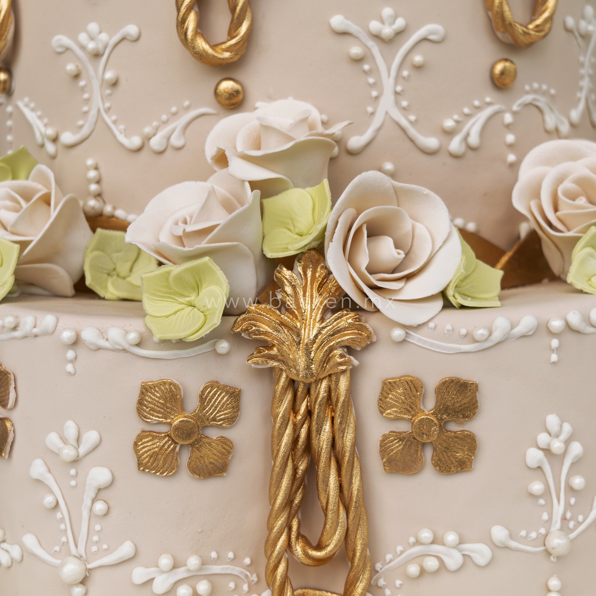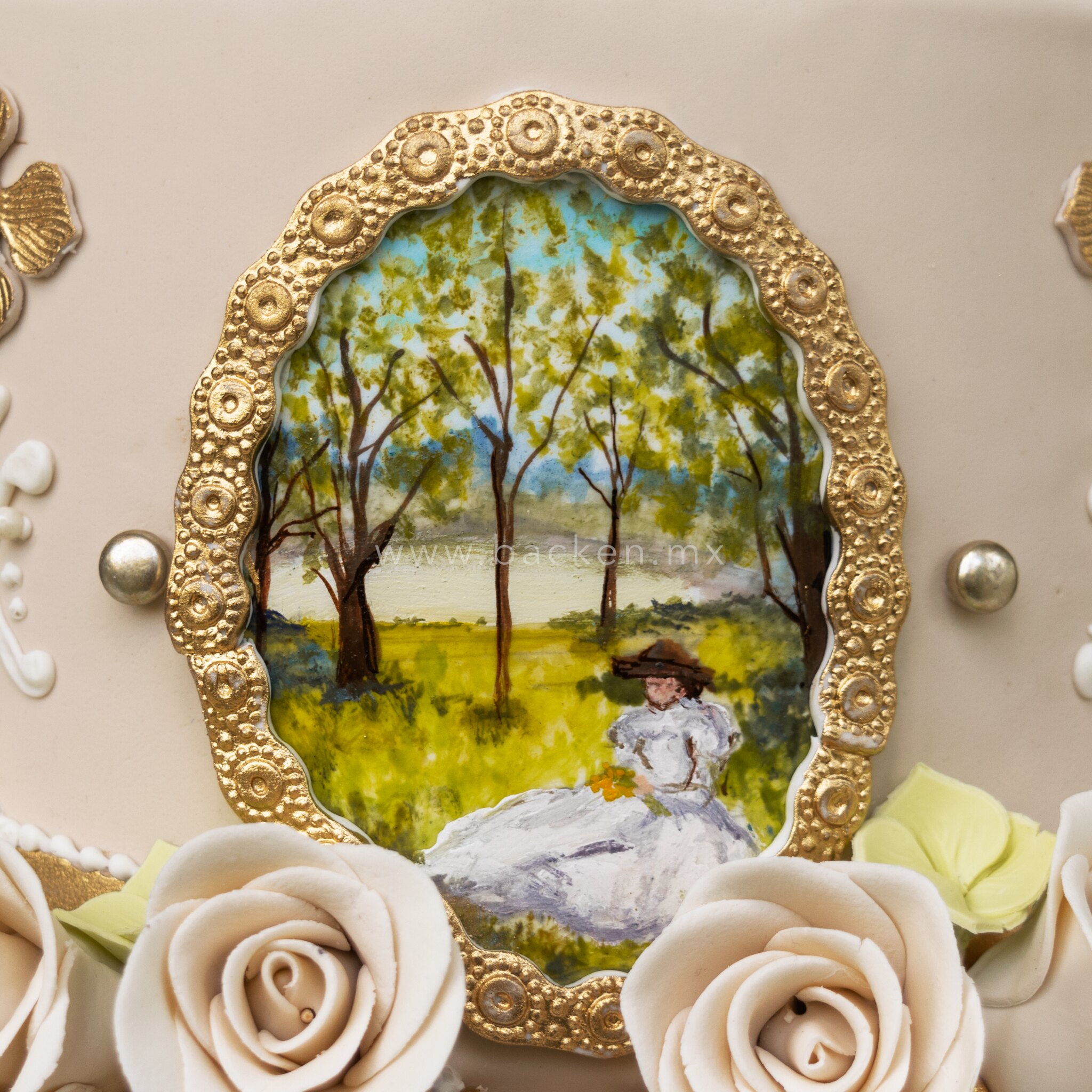 Este pastel personalizado de 15 años de cuatro pisos estilo imperial está creado para impresionar. Presenta incrustaciones en fino fondant con acabado tipo oro, flores de fondant perfectamente detalladas en cada nivel y, al centro, una pintura pintada a mano sobre fondant estilo Monet. Los tonos crema y dorado dominan el diseño, logrando una pieza majestuosa, exclusiva y digna de una celebración inolvidable.