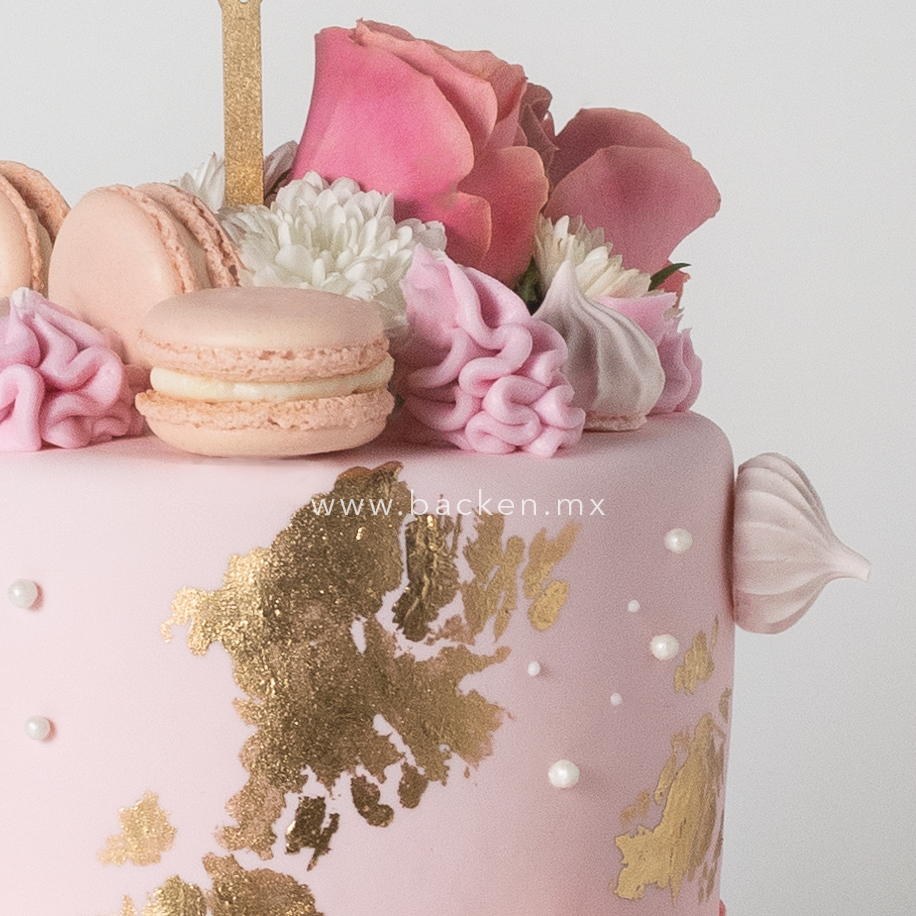 Este pastel personalizado de 15 años de dos pisos en tono rosa palo combina dulzura y elegancia en cada detalle. Está decorado con macarons, rosas en tonos rosados y crisantemos blancos, creando una composición delicada y armoniosa. Sobre el fondant destacan manchones dorados que aportan un toque moderno y sofisticado, ideal para una celebración juvenil y llena de estilo.