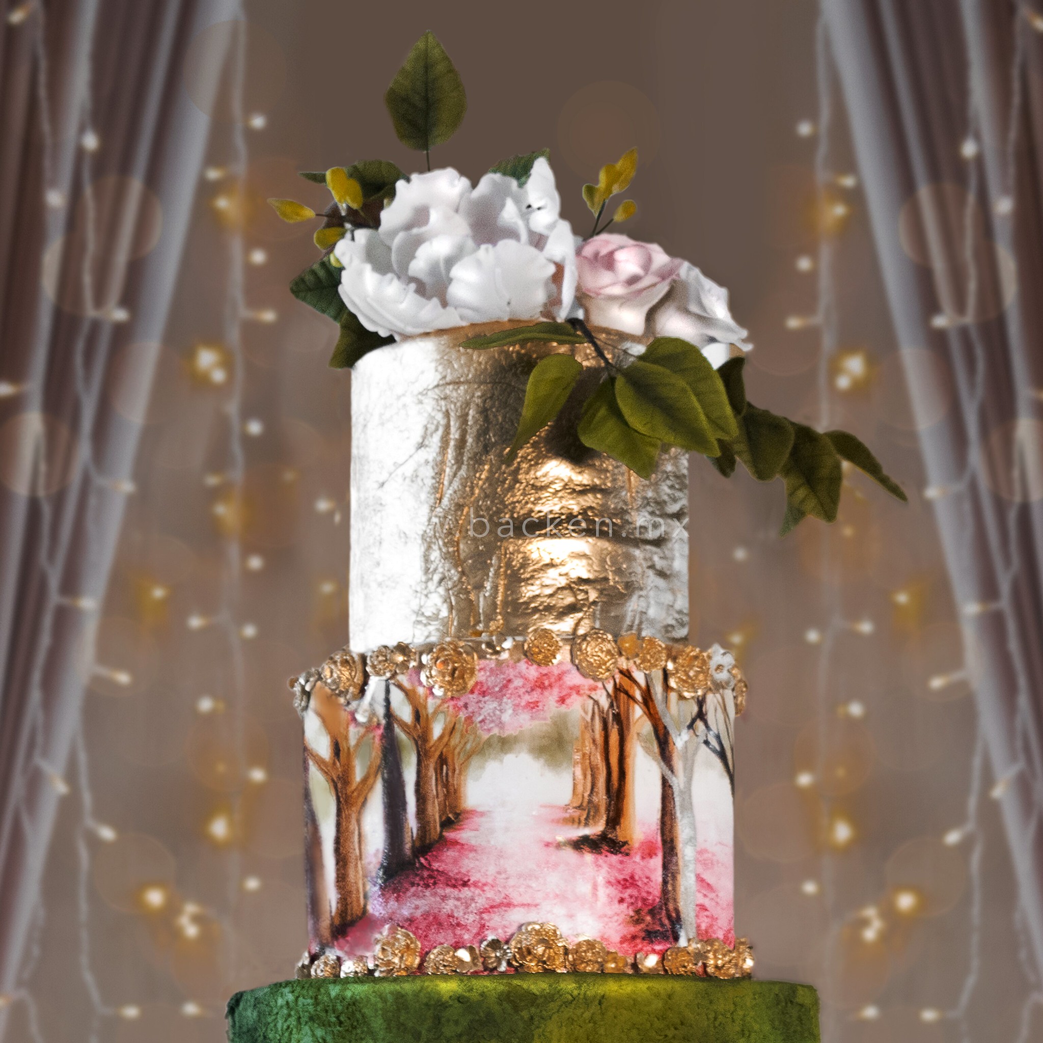 Este pastel personalizado de 15 años de cuatro pisos está inspirado en un bosque encantado, con un diseño lleno de detalles naturales que transmiten magia y sofisticación. Texturas orgánicas, elementos florales y acabados delicados crean una pieza imponente y armoniosa, perfecta para una quinceañera que sueña con una celebración mística y completamente inolvidable.