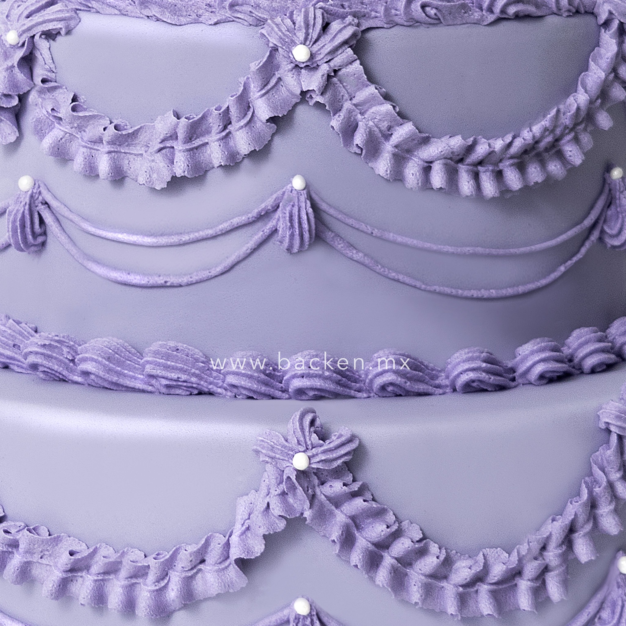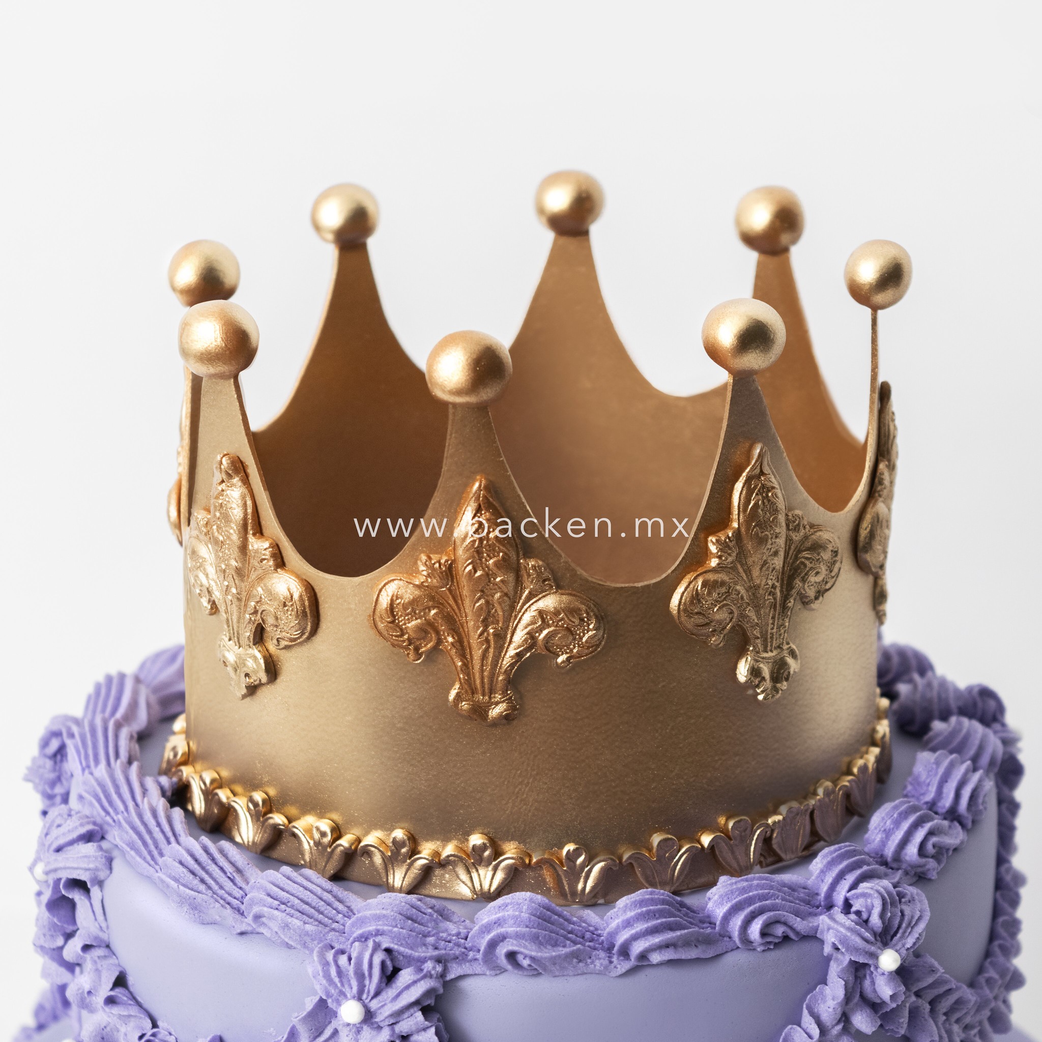 Este pastel personalizado de 15 años estilo vintage de dos pisos está cubierto con betún color lila, creando una estética delicada y elegante. En la parte superior destaca una corona dorada esculpida en fondant, que aporta un aire real y sofisticado, ideal para una quinceañera que sueña con una celebración única y llena de encanto.