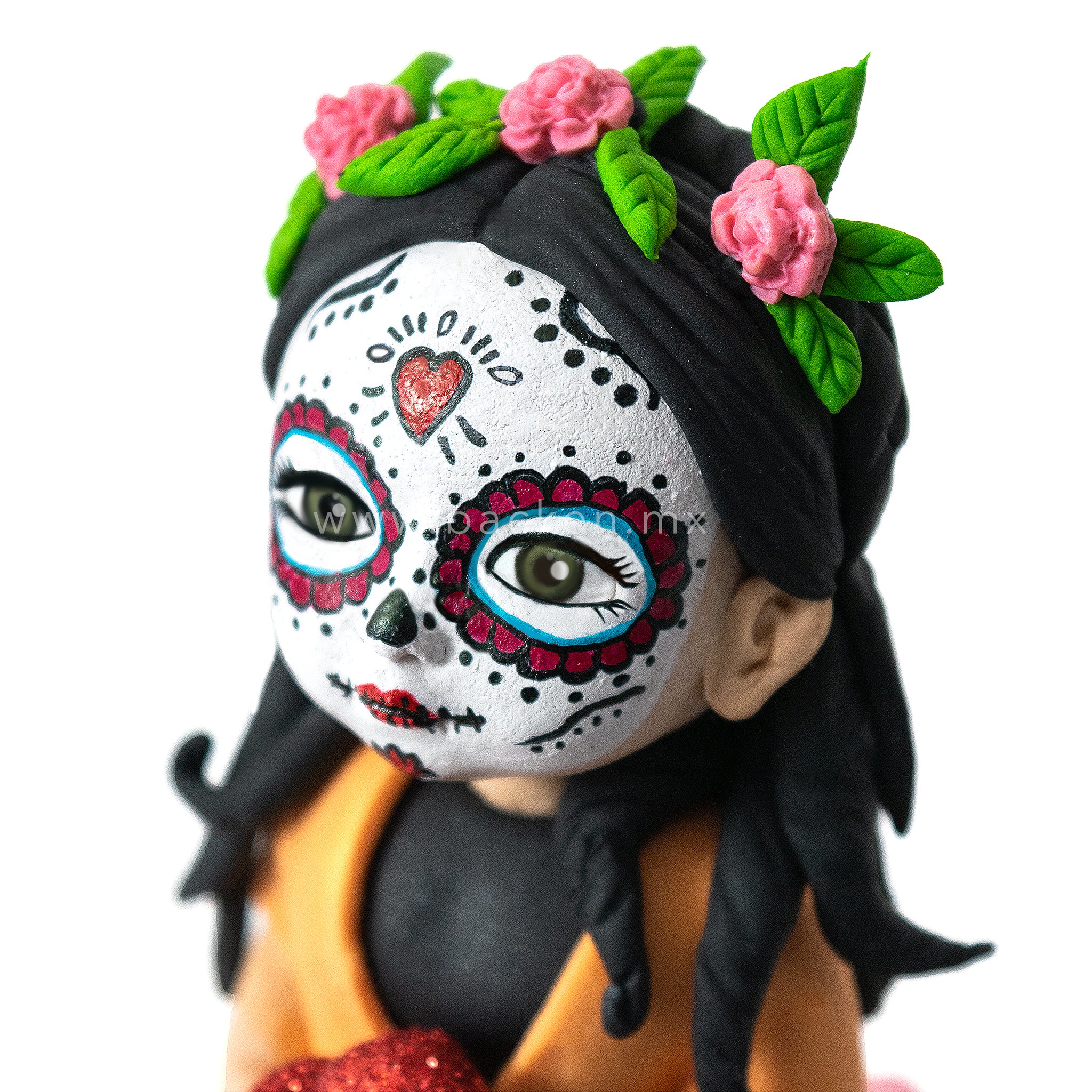 Este pastel personalizado con temática de Día de Muertos es una pieza de alta expresión artística, pensada para celebraciones que buscan elegancia y significado cultural. En la parte superior destaca la figura de una niña catrina, sosteniendo un corazón, perfectamente esculpida en fondant y pintada a mano con meticuloso cuidado, logrando una composición visual extraordinaria.
