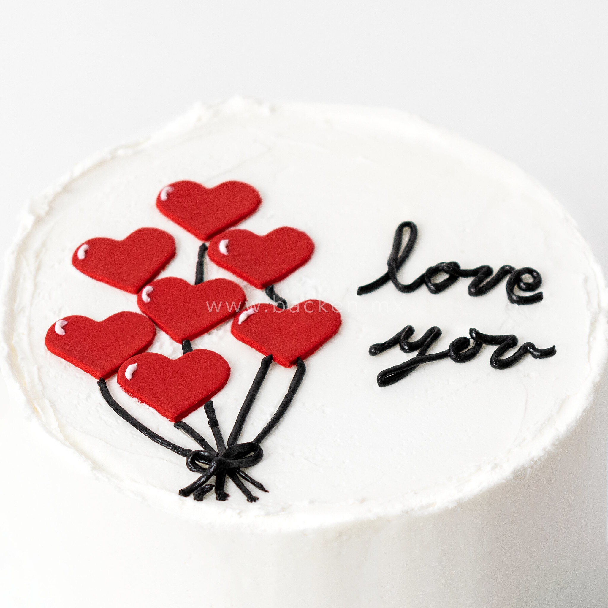 Celebra el amor con un pastel personalizado de San Valentín creado completamente en betún, ideal para quienes buscan un detalle romántico con un toque moderno. En la parte superior luce un hermoso ramo de globos en fondant rojo, modelados con precisión para darle volumen, brillo y una apariencia adorable y cuidadosamente delineado en betún negro, aparece el mensaje “ Love you”.