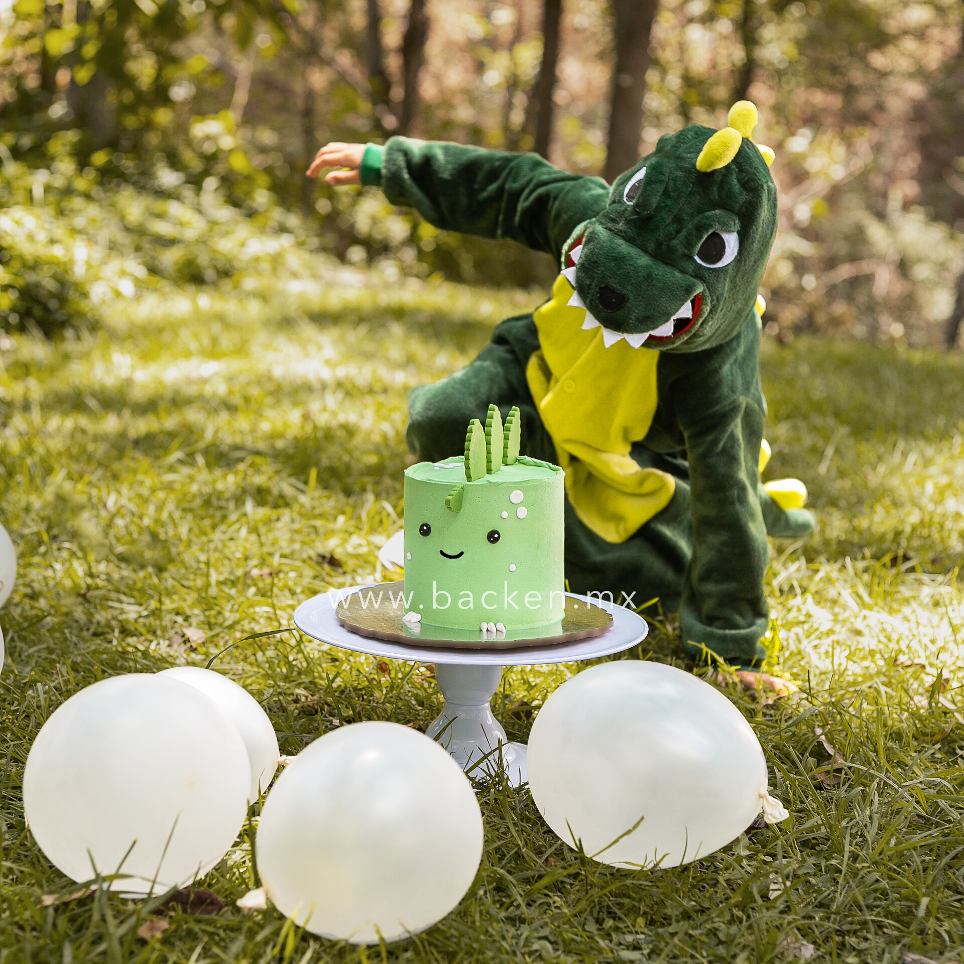 Tierno pastel con temática de dino para bebé cubierto con betún verde, tiene un diseño sencillo pero original, perfecto para celebrar el cumpleaños de ese pequeño que le encantan los dinosaurios tiernos.